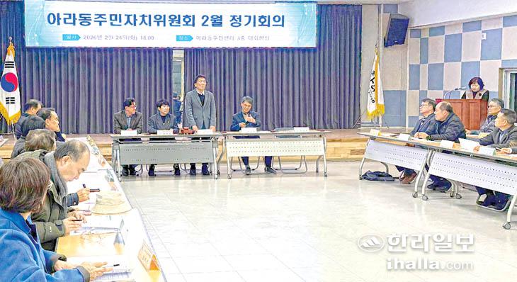제주시 아라동 주민자치위원회(위원장 양광수)는 지난 24일 아라동주민센터에서 2월 정기회의를 열고 상반기 주민자치센터 프로그램 운영과 주민참여형 직거래 장터 추진 계획을 논의했다.