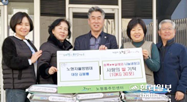 제주시 노형자율방범대(대장 김봉룡)는 지난 23일 노형동주민센터(동장 고광수)에서 운영하는 '솜뽁 살레와 나눔냉장고'에 쌀 300㎏을 전달했다. 쌀은 대장 이·취임식을 축하하며 받은 쌀화환으로 마련됐다.