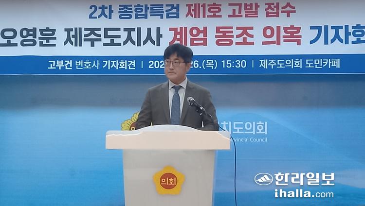 고부건 변호사가 26일 제주도의회 도민카페에서 기자회견 열고 오영훈 제주도지사를 2차 특검에 고발했다고 밝혔다. 오소범 기자