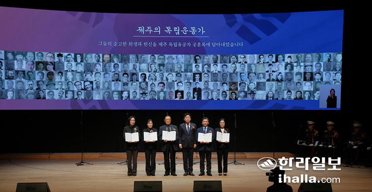 지난 1일 문예회관 대극장에서 열린 제107주년 3·1절 기념식에서 독립유공자 공훈록을 후손들에게 전달하고 있다. 제주도 제공