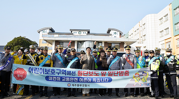 제주동부경찰서(서장 권용석)는 4일 신학기를 맞아 자치경찰단, 교직원, 학부모회, 모범운전자회 등 유관단체 회원 150여 명과 함께 지역 내 초등학교 10개소에서 동시 합동 캠페인을 개최했다.