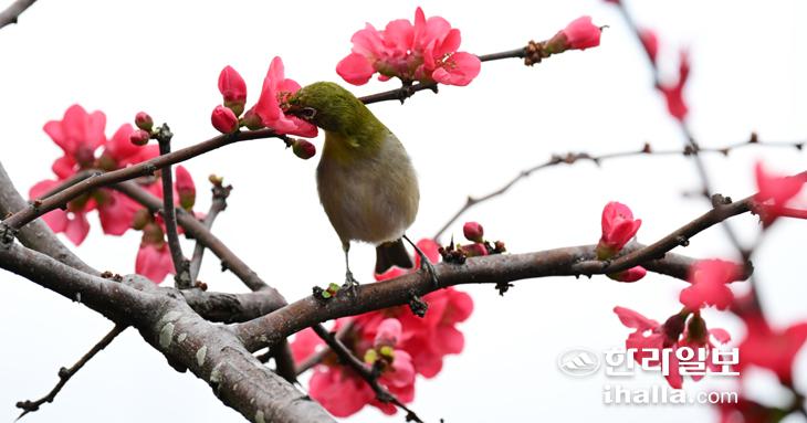 [한라일보] 초봄 날씨를 보인 10일 제주시 노형동의 한 가정집 정원을 찾은 동박새 한 마리가 꽃망울을 터트린 명자꽃 나무에서 꿀을 따먹고 있다. 강희만기자