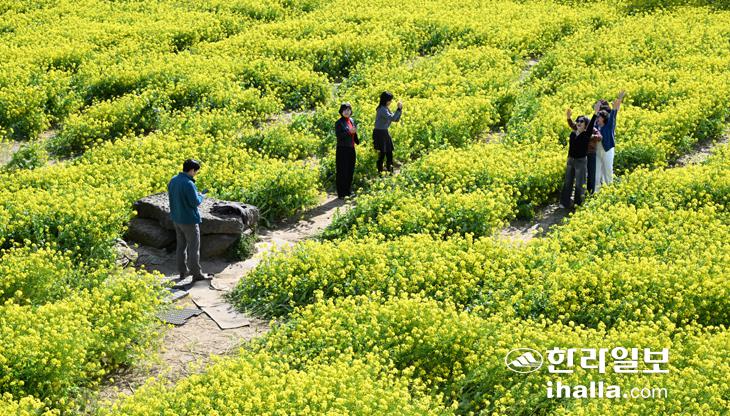 [한라일보] 11일 서귀포시 안덕면 산방산 인근 도로변 유채밭을 찾은 관광객들이 사진을 촬영하며 제주의 봄 정취를 한껏 즐기고 있다. 강희만기자