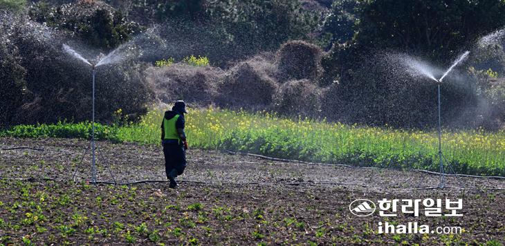 [한라일보] 11일 서귀포시 안덕면 사계리의 들녘에서 한 농민이 스프링클러를 이용해 메마른 농경지에 물을 살포하고 있다. 강희만기자