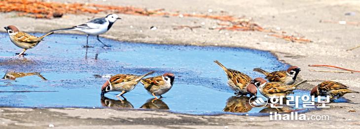 [한라일보] 11일 제주시 애월읍 공한지 물웅덩이에 목마른 참새들이 찾아와 목을 축이고 있다. 강희만기자