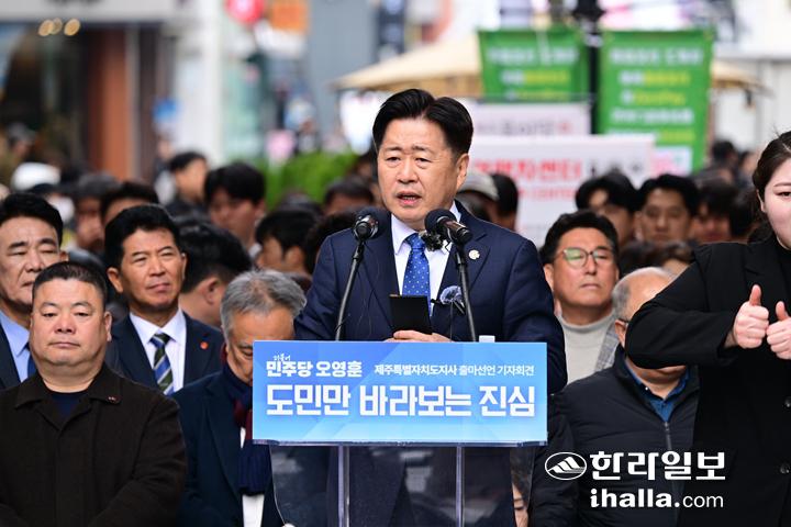 오영훈 제주도지사가 15일 제주시 칠성로에서 제9회 전국동시지방선거 제주도지사 출마 기자회견을 하고 있다. 강희만 기자