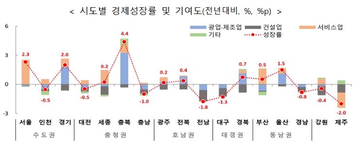 지난해 전국 GRDP 성장률은 전년 대비 1.0% 증가했다. 충북(4.4%)과 서울(2.3%), 경기(2.0%), 울산(1.5%), 경북(0.7%), 부산(0.5%), 전북(0.4%), 광주(0.2%), 세종(0.2%) 등 9개 시도는 증가했다. 반면 제주를 포함한 전남(-1.8%), 대구(-1.3%), 충남(-1.0%), 경남(-0.8%), 대전(-0.5%), 인천(-0.5%), 강원(-0.4%) 등 8개 시도는 감소했다.