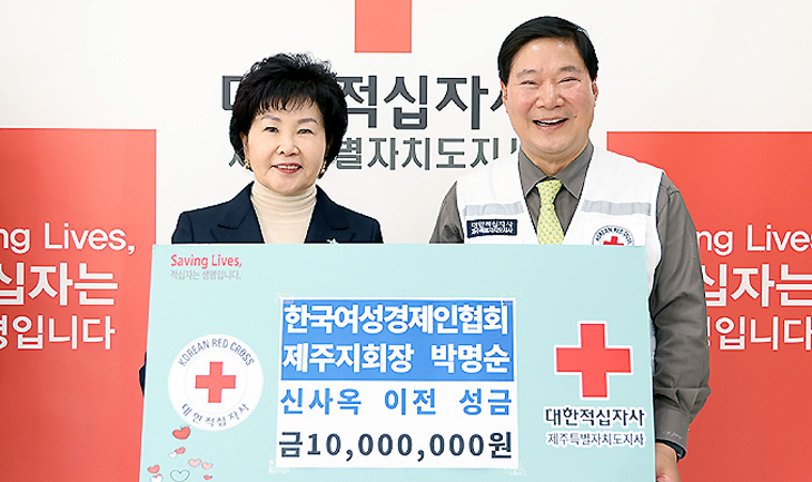 한국여성경제인협회 박명순 제주지회장은 최근 대한적십자사 제주특별자치도지사(회장 정태근)의 신사옥 이전을 기념해 성금 1000만원을 전달했다.
