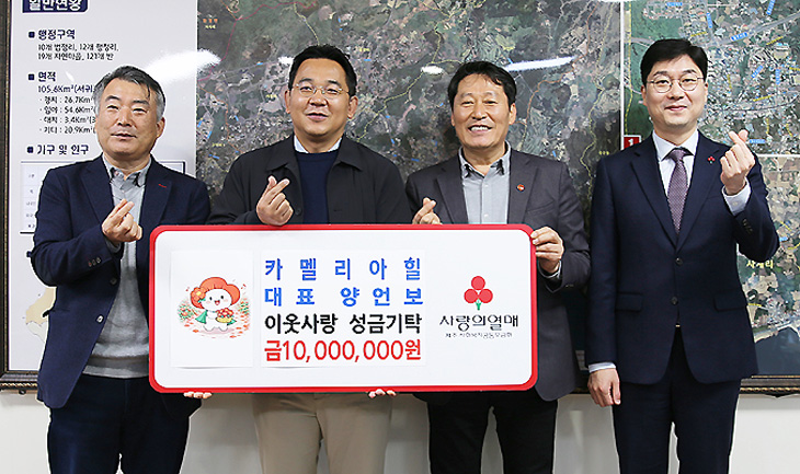 서귀포시 안덕면 소재 카멜리아힐(대표 양언보)은 지난 1일 안덕면(면장 김태유)을 방문해 지역 내 어려운 이웃을 위해 사용해 달라며 제주사회복지공동모금회(회장 강지언)에 성금 1000만원을 기탁했다.