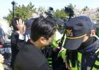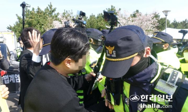 4·3 추념식이 열린 지난 3일 제주4·3평화공원 앞에서 극우 유튜버들과 4·3단체가 동시에 집회를 진행하면서 경찰이 충돌을 막고 있다. 양유리기자