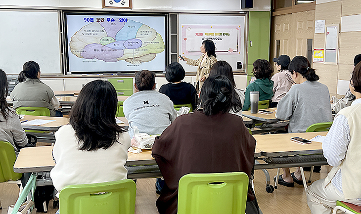 한동초등학교(교장 장원구)는 지난 6일 보호자 20여 명을 대상으로 '자녀를 주도적인 아이로 키우는 슬기로운 학부모 교실'을 운영했다. 이날에는 박희순 전 제주대학교교육대학부설초등학교 교장이 특강에 나서 ▷유치원·초등 교육과정 이해 ▷뇌 발달 단계에 따른 적기 교육 ▷문해력과 정서회복력 등을 주제로 초등 저학년 시기에 길러야 할 핵심 역량을 설명했다.