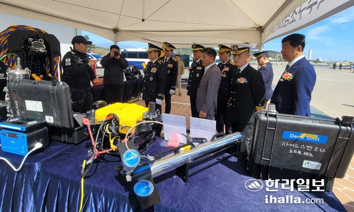 또 수중에서 음파를 통해 최대 300m 수심까지 수중물체를 탐지할 수 있는 장비인 사이드스캔소와 수중드론, SSDS(표면공급식 잠수)장비 등 특수구조 장비도 시연했다.