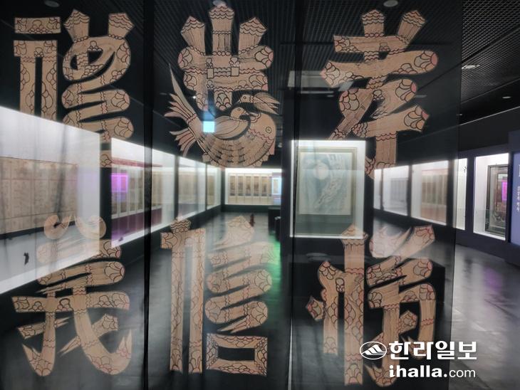 제주도 민속자연사박물관 특별전시실 입구 문자도를 새긴 투명한 천 너머로 전시된 유물들이 보인다. 진선희기자