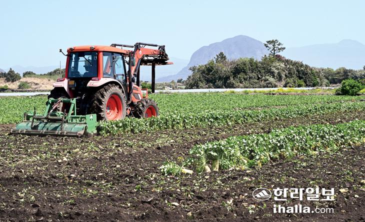 [한라일보] 16일 서귀포시 대정읍 하모리의 한 농경지에서 농민이 트랙터로 월동무를 갈아엎고 있다.