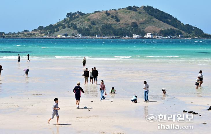 [한라일보] 16일 제주시 한림읍 협재해수욕장을 찾은 관광객들이 다소 이른 물놀이를 즐기고 있다.