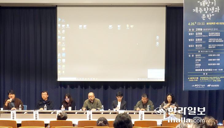 이날 심포지엄에서는 김재용 원광대 명예교수의 '조선문학가동맹과 제주 단선반대 항쟁', 방선미 제주대 강사의 '제주 민주주의민족전선과 문학-4·3소설에 재현된 해방기 제주읍 지식인을 중심으로' 주제 발표도 진행됐다. 김재용 교수는 "제주민중의 입장에서 제주4·3을 바라보는 역사적 상상력이 필요하다"고 했다. 방선미 강사는 김석범의 장편 '화산도'와 한라일보에 연재됐던 현길언의 주간소설 '한라산'을 살펴보며 해방기 제주읍 지식인을 의료인·언론인·통역가로 나눠 검토했다.