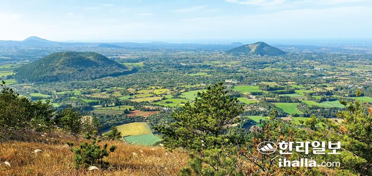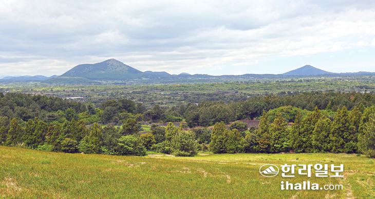 달랑쉬오름(왼쪽)과 둔지오름(오른쪽), 둔지오름은 위가 유난히 볼록하다. 사진=김찬수