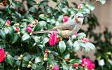 [한라일보] 23일 제주시 한 주택가에 심어진 애기동백꽃에 직박구리 한마리가 날아와 꽃잎을 물고 주변을 살피고 있다. 강희만기자 ■기사제보▷카카오톡 : '한라일보' 또는 '한라일보 뉴스'를 검…