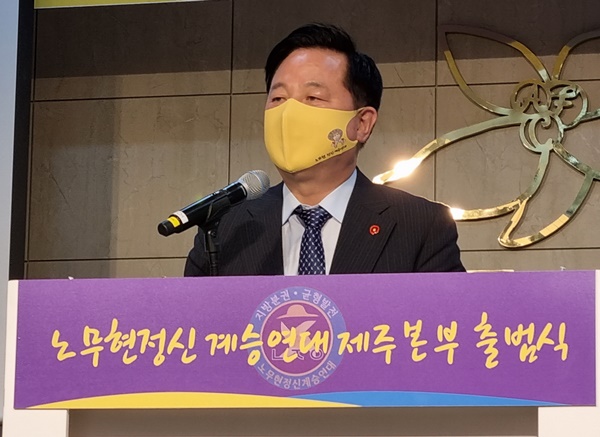 5일 오후 아젠토피오레 컨벤션홀에서 노무현 정신 계승연대 제주본부 출범식에서 김두관 더불어민주당 국회의원이 인사말을 하고 있다. 이상민 기자