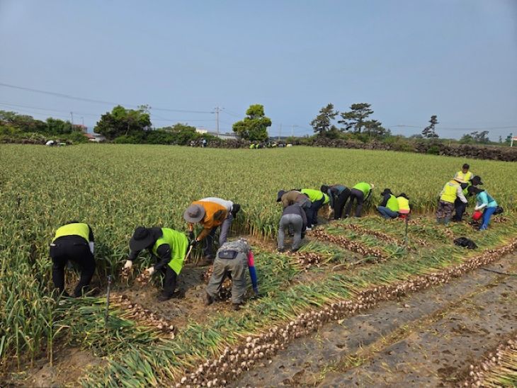 12일 대정지역 마늘밭에서 진행된 마늘수확 일손 돕기. 제주농협 제공
