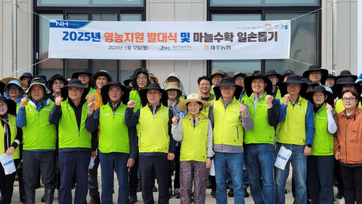 제주도와 제주농협은 12일 서귀포시 대정농협 APC센터에서 정무부지사, 도의원, 제주농협 임직원 및 농업인단체, 해병대9여단, 제주시·서귀포시 자원봉사센터 등 50여 명이 참여한 가운데 농촌일손 돕기 시작을 알리는 영농지원 발대식을 가졌다. 제주농협 제공
