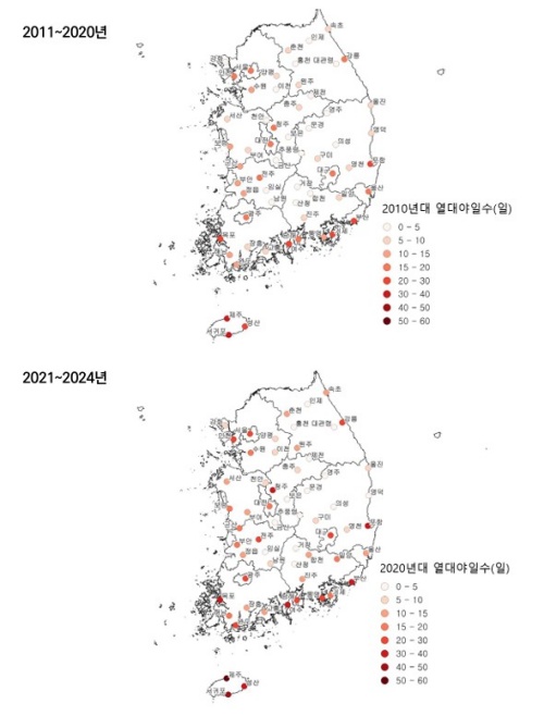 특히 2010년대에는 제주와 남해안 지역에서의 열대야일수가 급증했고, 2020년대에는 전국 대부분 지역에서 열대야일수가 많이 발생하고 증가한 경향을 보였다. 제주가 타지역에 견줘 10년가량 빠른 셈이다.