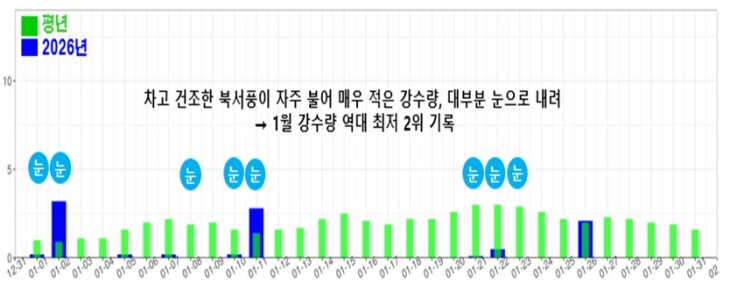 제주지방기상청이 4일 발표한 '2026년 1월 제주도 기후특성 분석 결과'에 따르면 평균기온은 6.1℃로 평년(6.2℃)과 비슷했으나, 중·하순의 큰 기온 변동 속에 강수량은 9.4㎜로 역대 최저 2위, 상대습도는 60%로 역대 최저 1위를 기록했다.