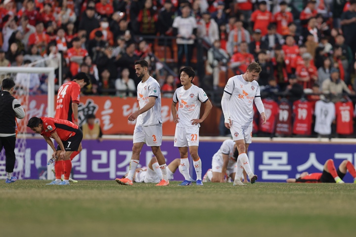 22일 강원과의 K리그1 5라운드에서 후반 극장골을 내주고 1-1로 비긴 후 제주SK 선수들이 허탈해 하고 있다. 한국프로축구연맹 제공