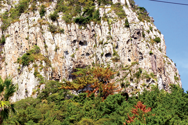 [한라일보] 산방산은 안덕면 사계리에 있다. 높이 395m이다. 분화구가 없다. 마치 돔 모양으로 사방이 절벽을 이루고 있다. 남서 사면 해발 중간 정도 높이 절벽에 길이 10여m, 너비 5m, 높이 5m쯤 되는 동굴이 있다. 천장에서 물이 떨…