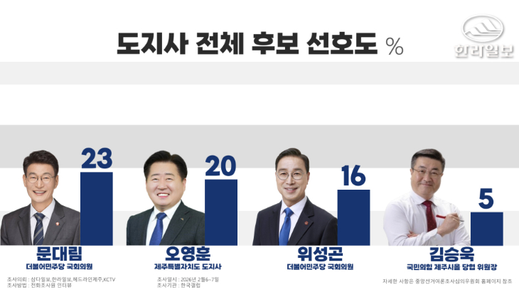 [한라일보] 제주도지사 후보 선호도 조사 결과, 더불어민주당 주자들의 강세 속에 치열한 선두 다툼이 벌어지고 있습니다. 전체 후보 선호도에서 문대림 더불어민주당 국회의원이 23퍼센트로 1위를 차지했고, 오영훈 제주도지…