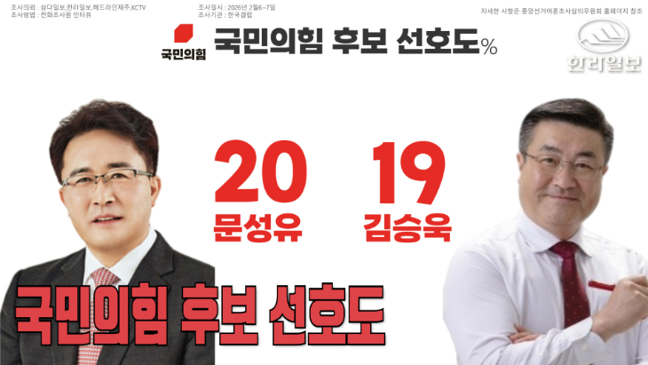 [한라일보] 국민의힘 내부의 차기 제주도지사 후보 적합도 조사 결과입니다. 국민의힘 후보군 중에서는 문성유 전 기획조정실장이 20퍼센트를 기록하며 가장 높은 지지를 얻었습니다. 이어 김승욱 제주시을 당협위원장이 19퍼…