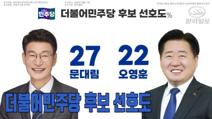 [한라일보] 더불어민주당 내 차기 제주도지사 후보 선호도 조사 결과입니다. 문대림 국회의원이 27퍼센트의 지지를 얻으며 선두를 달리는 가운데, 오영훈 제주도지사가 22퍼센트를 기록하며 오차범위 안에서 각축을 벌이고 있…